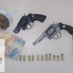 MATERIAL APREENDIDO: ▪️ 2 revólveres calibre 38, de marca Taurus e numerações JE80579 e 127728 com 6 munições deflagradas e cinco munições picotadas. R$ 132. 40g de maconha, um telefone celular.
